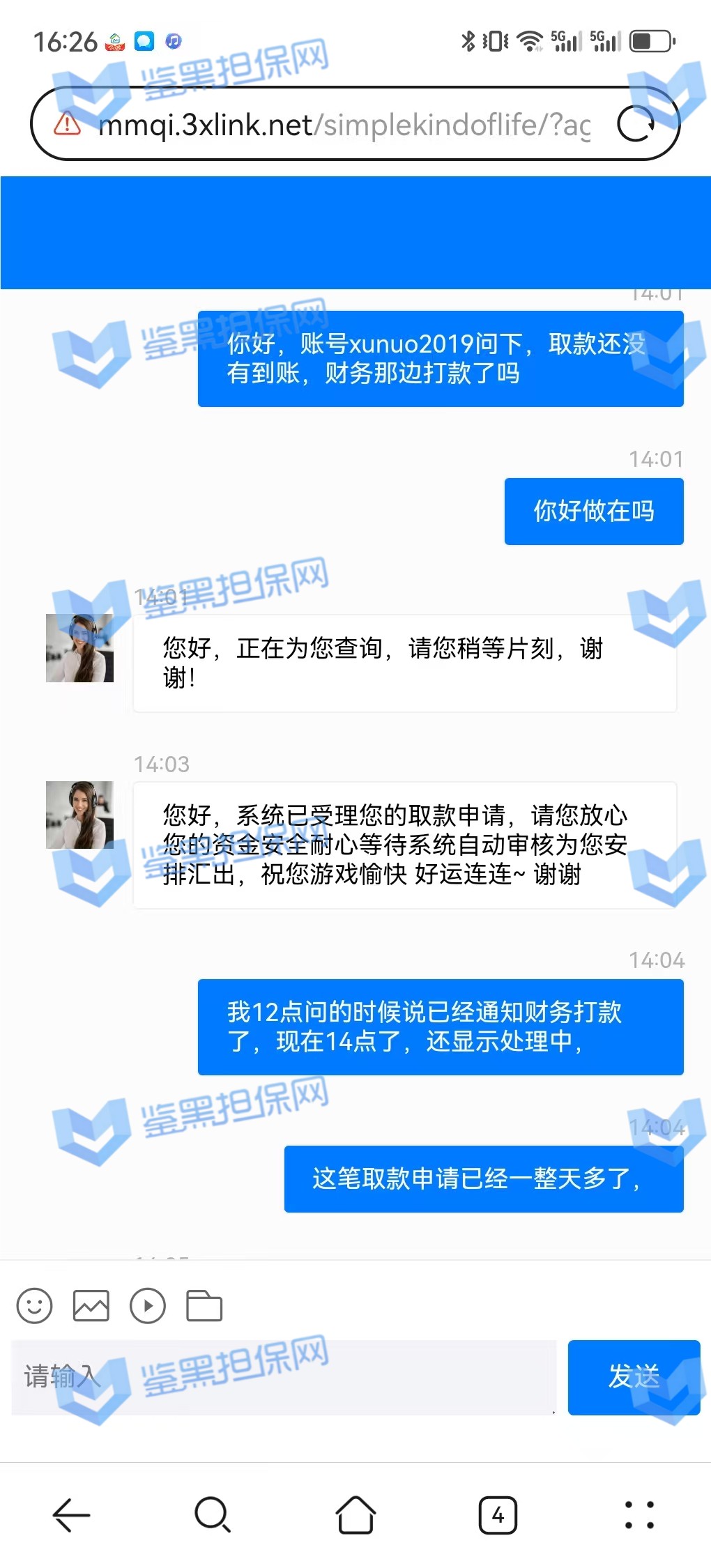 3、鉴黑担保网维权专员联系该平台核实情况,相关负责人表示财务繁忙,出款用户较多,需要依次处理,但是已过去2天时间且网站也没有发布提款繁忙公告通知玩家,维权专员沟通后要求尽快出款,对方表示会尽快处理。