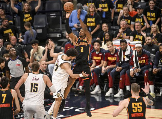 雷霆队在第二节以8-0的小高潮开局,他们反超领跑。戈登三分还击,维金斯和多尔特各中三分,本节进行了5分钟时雷霆队以37-32领先。布劳恩三分缩小差距,两队之后各得几分,穆雷跳投命中,半场前3分10秒时掘金队以41-42落后1分。雷霆队暂停后进攻开火,威廉姆斯和亚历山大轮流投中三分,他们引领球队打出14-2的进攻高潮,雷霆队取得两位数优势。约基奇连投带罚追回3分,亚历山大和威廉姆斯合取4分,半场结束时雷霆队以60-46领先14分。