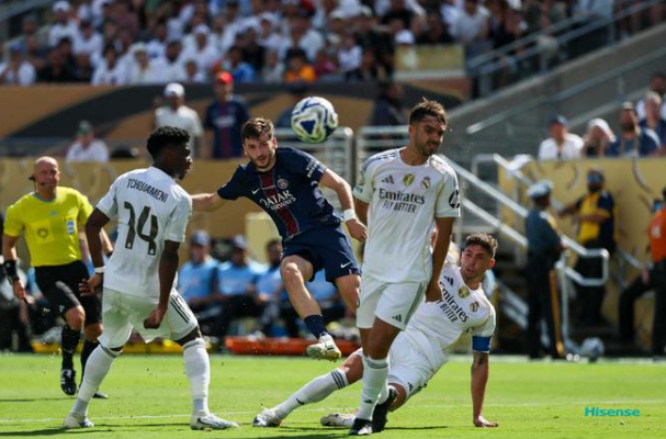 比赛第六分钟,“大巴黎”右路进攻,杜埃下底横扫门前没有产生威胁,但皇马中后卫阿森西奥停球失误送礼,登贝莱赶在皇马门将库尔图瓦之前上抢倒地回做,鲁伊斯跟进推射先拔头筹。仅仅3分钟后,皇马后防再次犯错,吕迪格回传失误,登贝莱单刀推射远角破门,“大巴黎”再下一城。第24分钟,阿什拉夫右路推进下底横传,两名队友在中路包抄,鲁伊斯面对巴尔韦德的追防冷静打门得手,将比分改写为3:0。